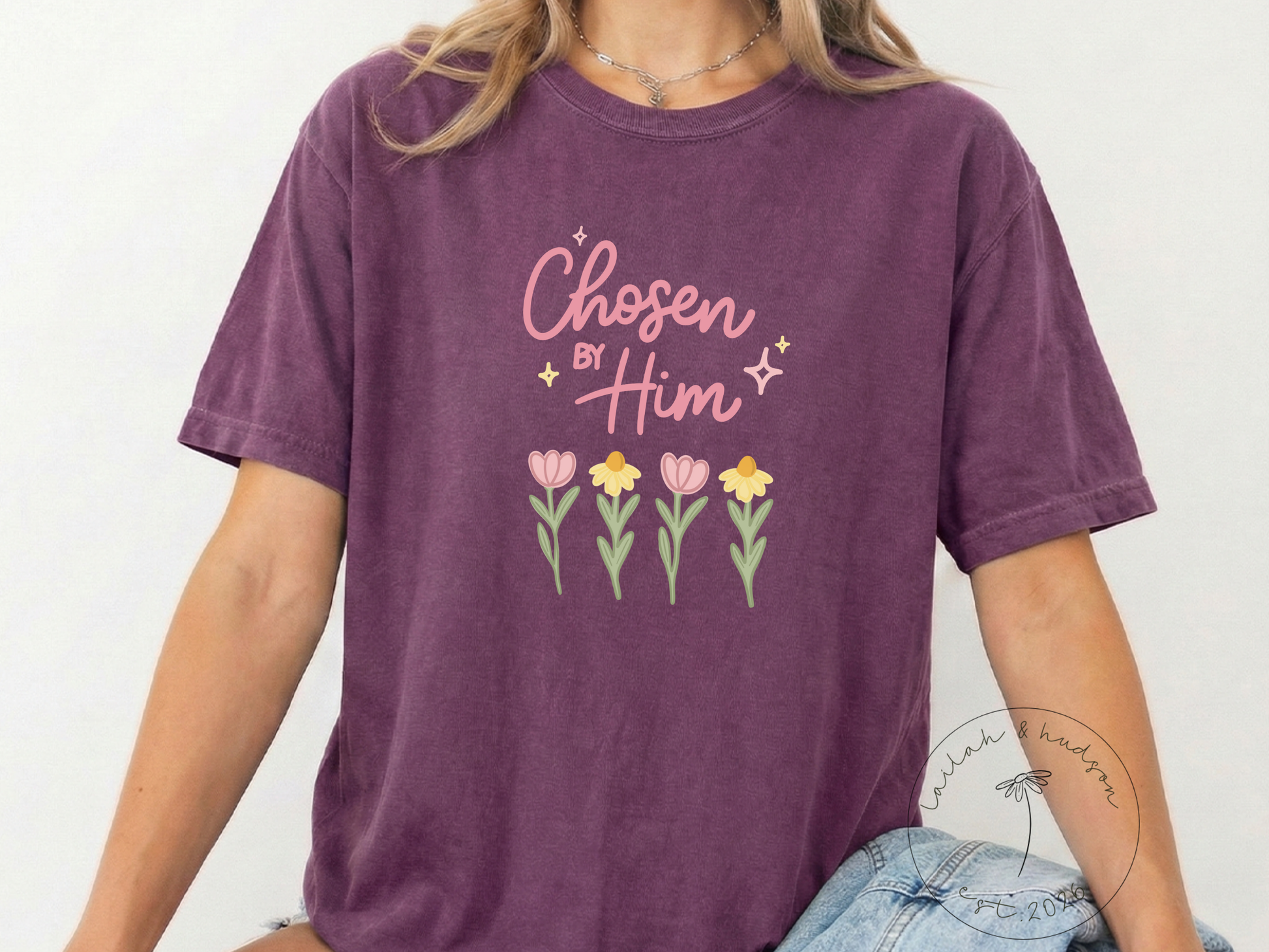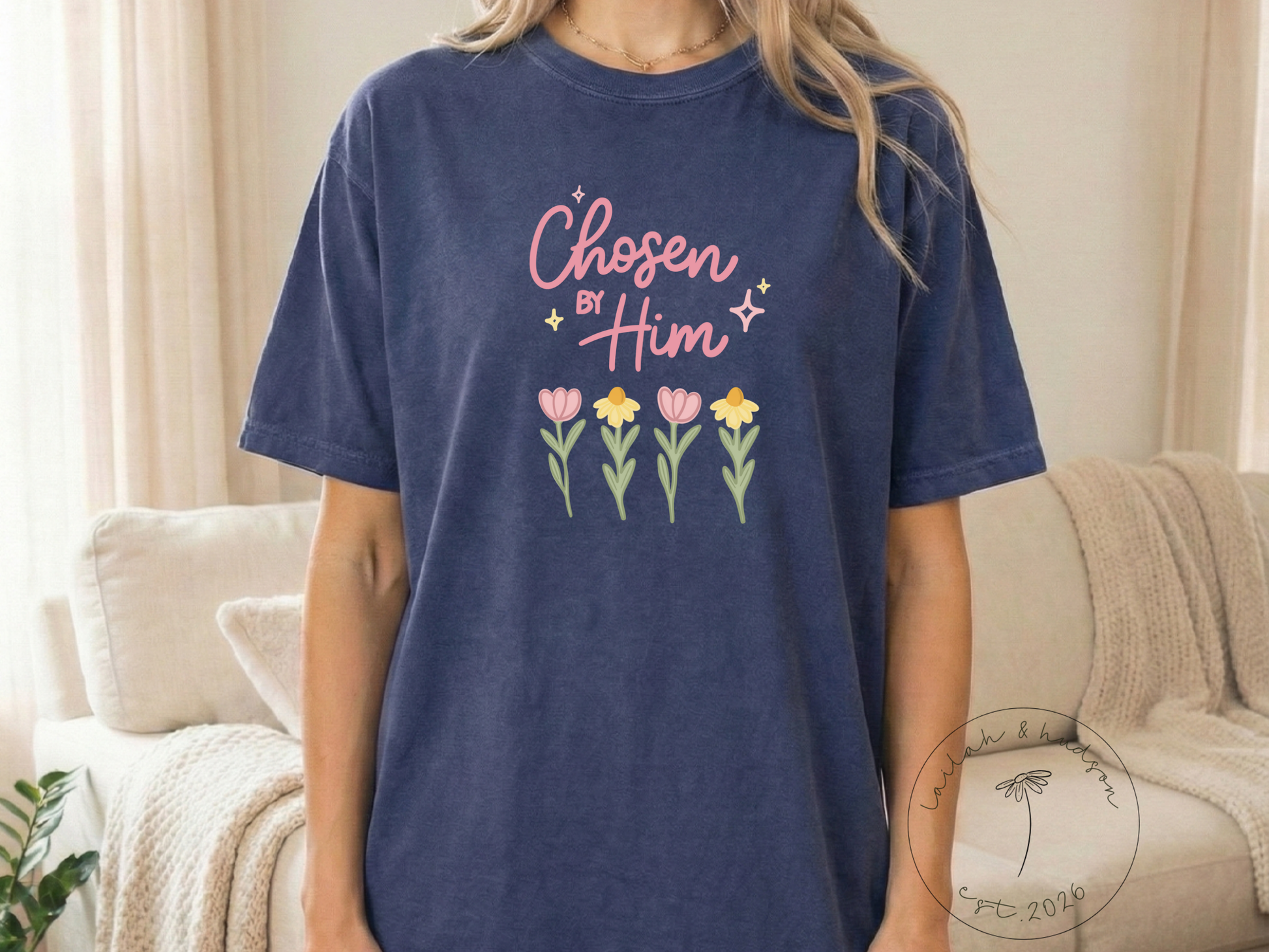 Quiet confidence rooted in faith. "Chosen by Him" is a soft yet meaningful reminder of identity and belonging. With warm, earthy tones and a minimalist design, this tee pairs beautifully with everyday wear while carrying a deeper message.